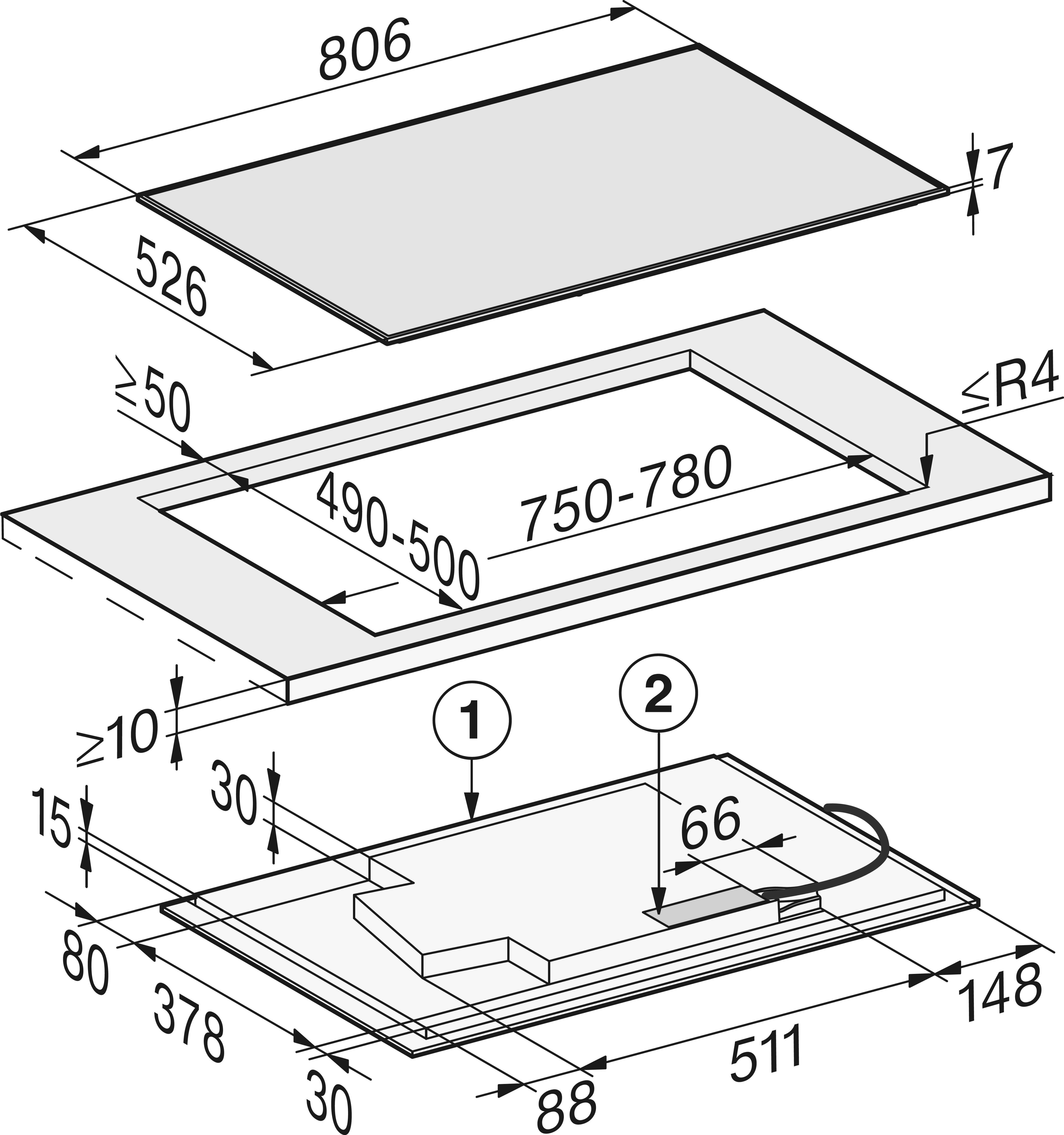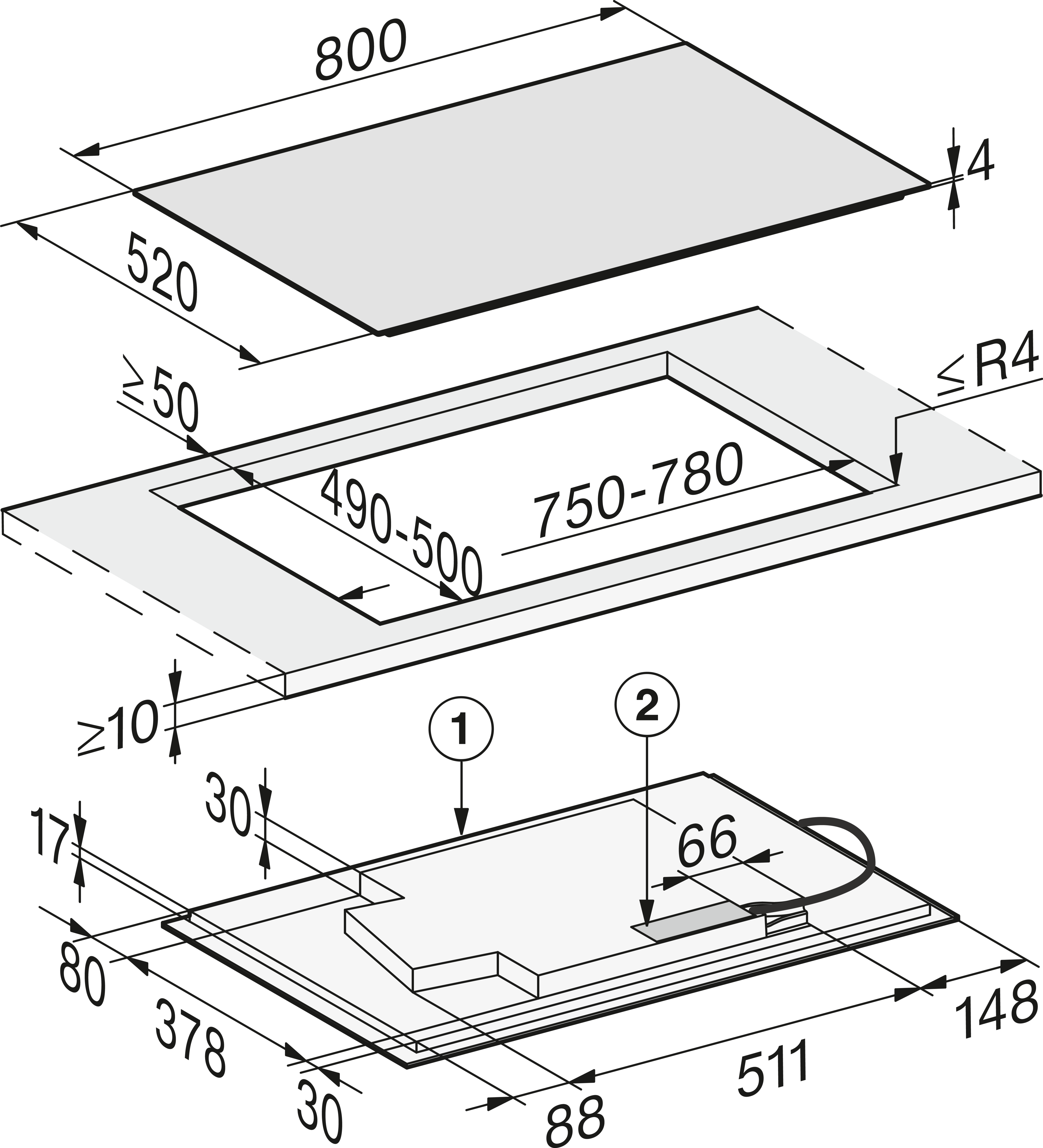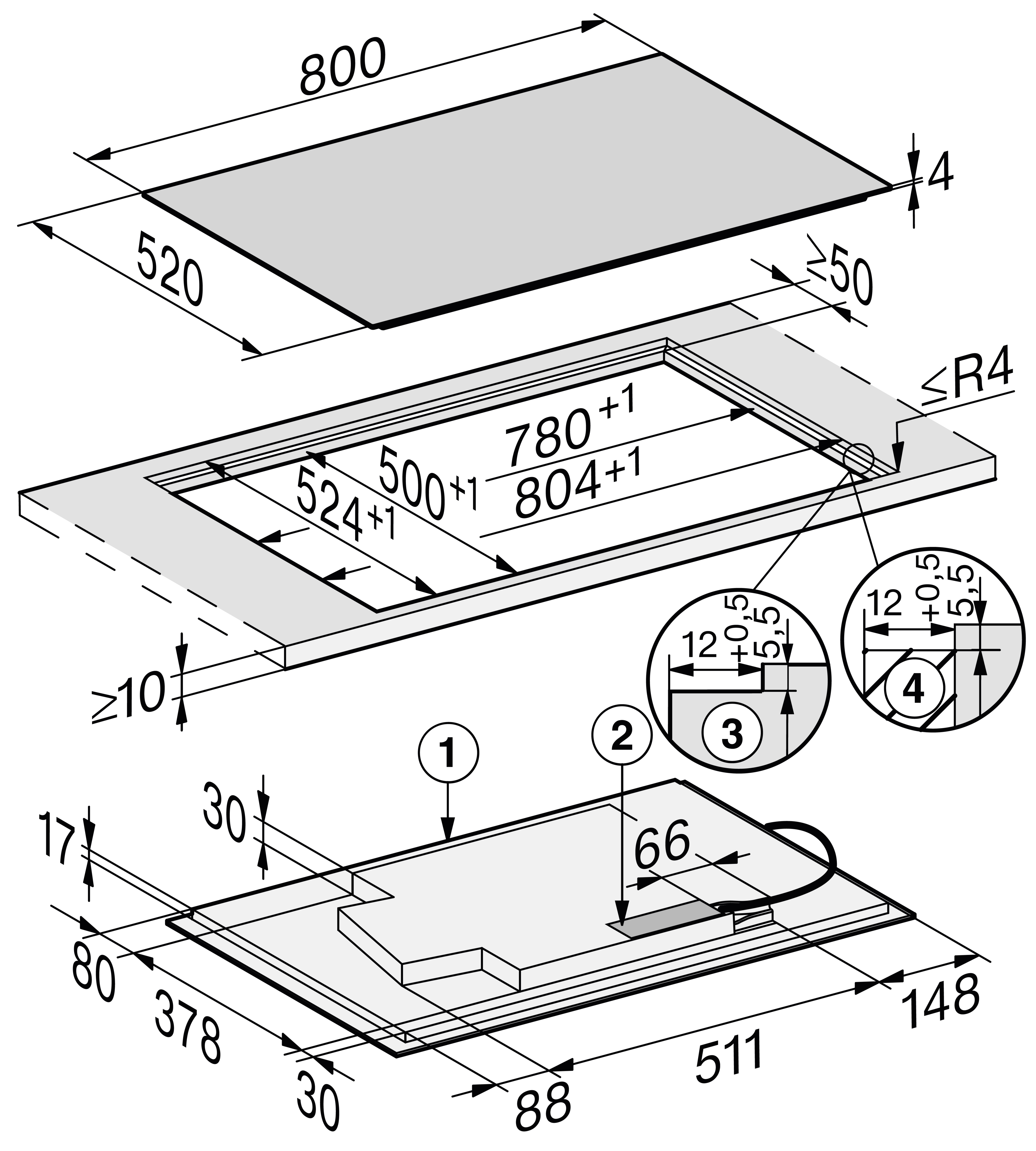 Внутренние размеры выреза в мм (ширина) для встраивания заподлицо
